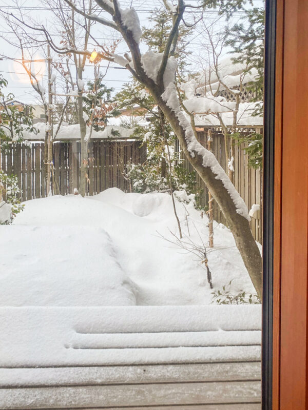 本日のアトリエの庭。1段目のウッドデッキは見事に雪に埋もれてしまいました⛄