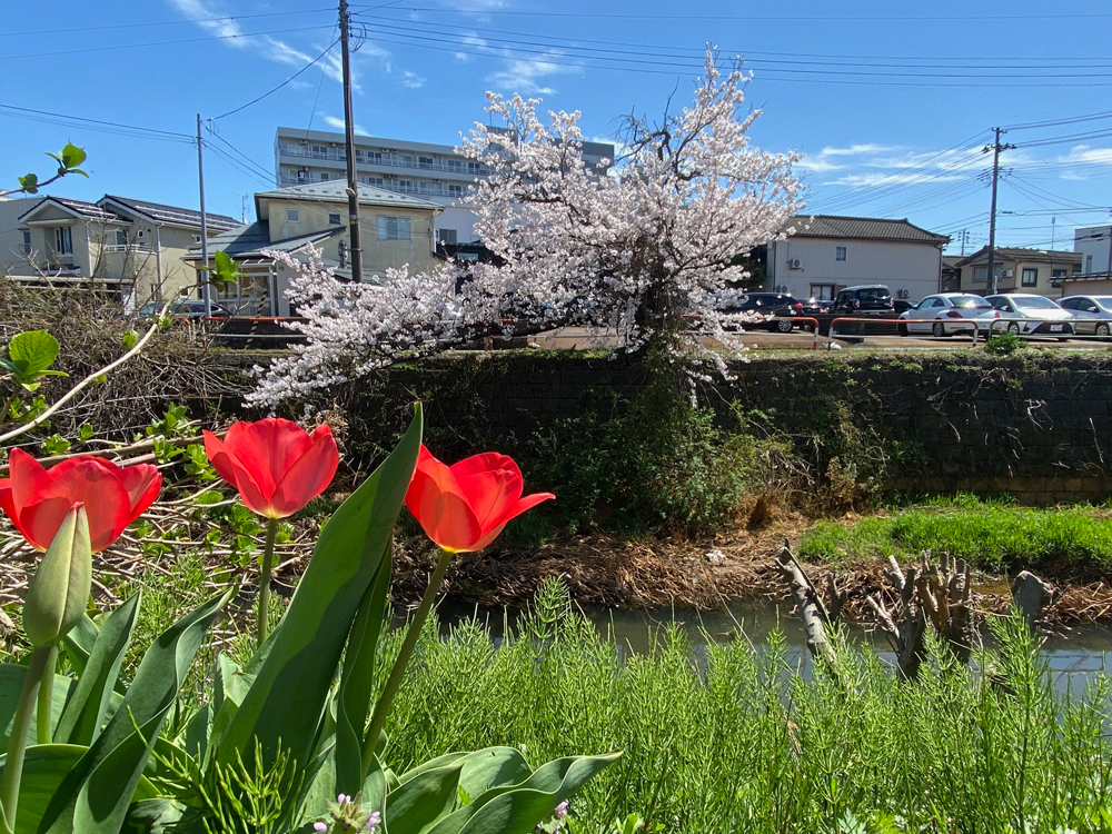 柿川沿いの桜。チューリップも綺麗に咲いています🌷