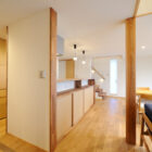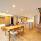 ナラの床板と、エッグウォールの白い壁を組み合わせにしたシンプルな内装。使い勝手の良い回遊性のある家事動線。さらに、人を招いておもてなしする工夫が随所にちりばめられています。