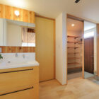 リビング→物干し付きの脱衣室→ファミリークローク→アイランドキッチンへと通り抜けられ、家事を効率よくこなせる回遊動線にしています。