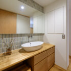 造作の洗面や木扉のキッチンカップボード、無垢材の床と天井と木のぬくもりが感じられる、温かみのある内装となっています。