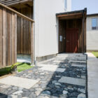 青石と御影石が敷き込まれたアプローチが味わい深く魅力的です。