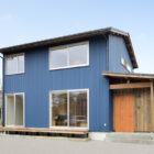外観はネイビーのガルバリウム鋼板をメインに使用しつつ、玄関回りは板張りに。