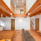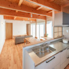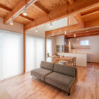 1階のリビングダイニングキッチンは、天井が吹き抜けや梁現しになっているため、室内に奥行が生まれ、木材の温もりを生かした室内デザインに。